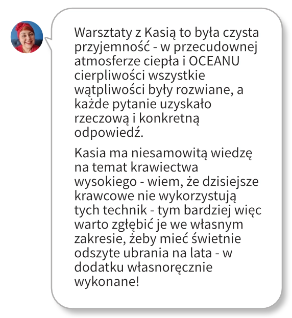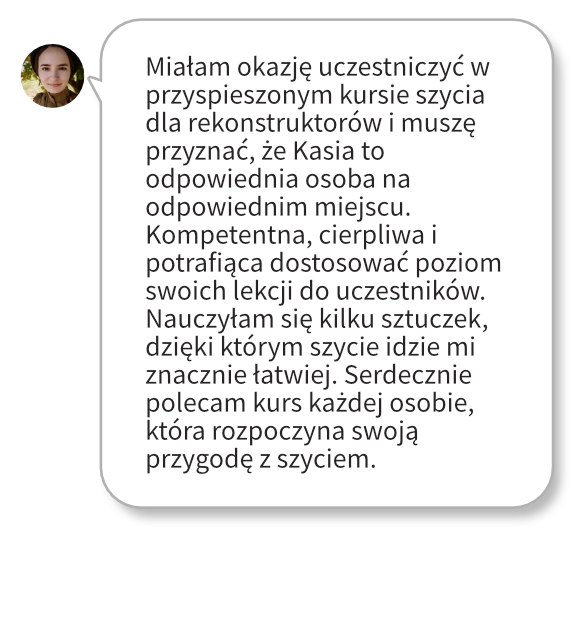Bardzo polecam naukę szycia i kroju u Kasi. Choć umiałam wcześniej obsługiwać maszynę i szyć proste rzeczy użytkowe, to tak naprawdę dopiero Kasia otworzyła przede mną tajemne wrota krawiectwa i pokazała szereg możliwości, w jakich ta wiedza może być wykorzystana. Dzięki pomocy Kasi i łopatologicznemu tłumaczeniu jak jest skonstruowany wykrój i jak go dopasować do siebie, uszyłam swoją pierwszą suknię w stylu XIX wieku. Wymagało to ze strony Kasi dużo cierpliwości, bo mam naturę dociekliwej pedantki i wszystko chciałam dokładnie mieć wytłumaczone, tak żebym nie tylko wiedziała jak coś zrobić, ale też “jak to działa”.