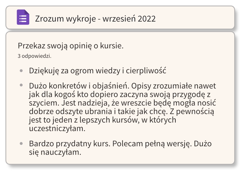 Nauka wykrojów wymaga czasu. Możesz samodzielnie testować kolejne modyfikacje i sprawdzać co z tego wyjdzie, jednak znacznie szybciej dojdziesz do perfekcji, jeśli pozwolisz się poprowadzić. Oczywiście w trakcie kursu możesz pracować we własnym tempie. Nie musisz też być na żywo, ponieważ dostęp do nagrań będziesz mieć przez rok. Jeśli w trakcie kursu zdążysz opanować tylko część tematów to i tak będziesz o tę wiedzę do przodu. Kurs rozłożyłam na 6 tygodni, aby w międzyczasie była przestrzeń na wypróbowanie w praktyce wiedzy zdobytej podczas kolejnych spotkań na żywo. Jednak to tylko moja sugestia – możesz to sobie zaplanować inaczej.